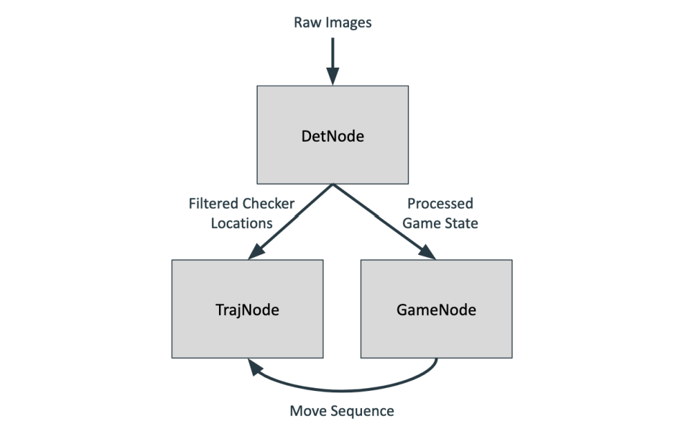 For the software, the system consisted of three main ROS nodes. The Detector node was continuously subscribed to the raw camera feed from the top view camera and published the detected position of all checkers and the board. Checkers were detected based on their colors and features, then filtered for existence and correspondence, before finally being sorted based on their positions. The Game node handled the high level playing state of the robot during the game. It generated a set of moves encoded by [source, destination, color] by subscribing to the Detector node’s published game states. This allowed the Game node to always have a real time accurate representation of the current game state.