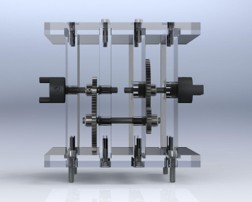 The main project of our ME14 was a transmission design. Given a motor powered at 12V nominal, a bike wheel load, and a required transmission footprint, we designed a two-stage geared transmission. The plates were milled from acrylic stock, and the shafts were turned from steel shaft stock. Gears were purchased off the shelf.