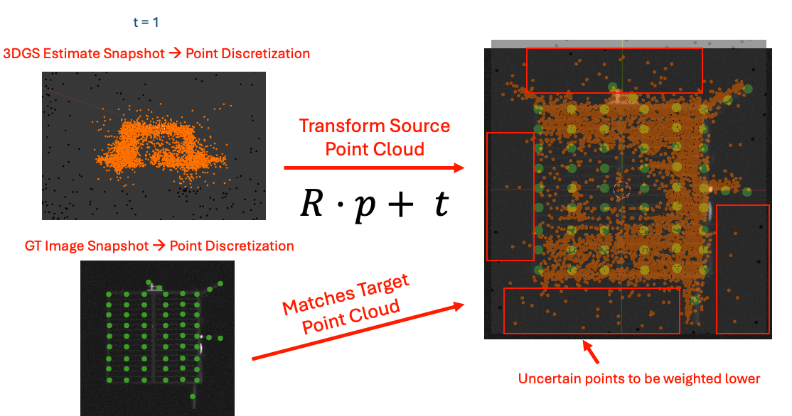 Because space often yields noisy images and dynamic, uncertain environments, we embedded a point-wise uncertainty metric called FisherRF into the 3DGS-derived point cloud to apply a weighting to the traditional iterative closest point (ICP) alignment process. This would enforce correspondences between points with higher certainty to a greater degree than those less-certain points.