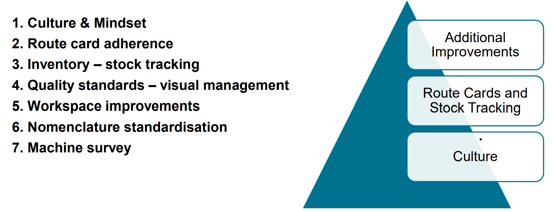 The objectives for this project were process-mapping of current WIP storage/flow, identifying factors contributing to high levels of shop floor WIP, and determining WIP pallet storage based on the current situation and future requirements.