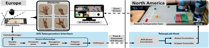 The system was developed around the iPhone 14-deployed TeleopLab. This iOS device was chosen as the development platform due to the mass-market adoption of iPhone devices and the TrueDepth camera array. Code was written in Swift 5, with MediaPipe GestureRecognizer used for hand detection and gesture classification. Three gestures enabled tethering the robot to the user’s palm pose, toggling the gripper open and closed, and resetting to a home position. The control system was built on ROS Noetic, with the host computer using the Ubuntu 20.04 OS.